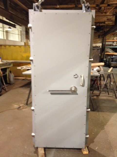 Construction is solid steel plate or composite structural steel and plate combination with concrete fill depending upon design load and size. Careful attention to the design of the hinging, latching and operating hardware assure ease of operation, minimum maintenance and maximum security. The units are fabricated per procedures outlined in the American Welding Society AWS Structural Welding Code for Steel and designs comply with AISC specifications and UFC 3-340-02 ‘Structures to Resist the Effects of Accidental Explosions’ (previously Dept. of the Army Technical Manual TM5-1300).